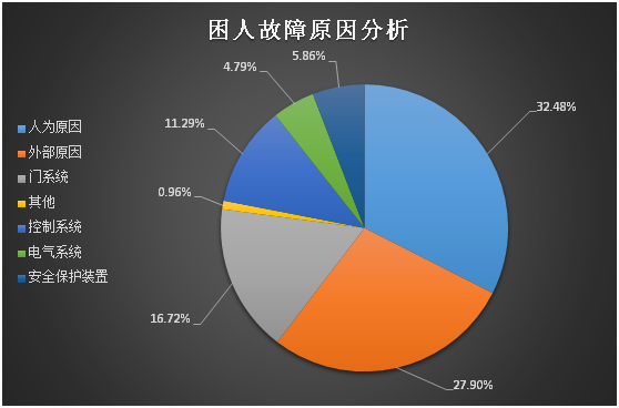 依据《电梯应急处置平台技术规范》(CPASE M001—2019),在人为原因、外部原因、门系统、曳引系统、导向系统、轿厢、控制系统、电气系统、安全保护装置九类故障中:人为原因故障(305起,占32.48%)、外部原因故障(262起,占27.90%)、门系统故障(157起,占16.72%)居前三位,其中生活(装修)垃圾导致开关门受阻困人265起、停电困人89起、门锁失效98起。