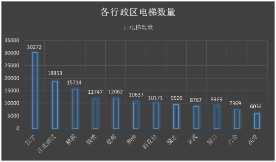 南京市12个行政区在用电梯分布情况如下,其中江宁区电梯数量最多30272台;高淳区电梯数量最少6034台。