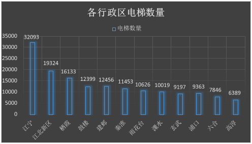 南京市12个行政区在用电梯分布情况如下,其中江宁区电梯数量最多32093台;高淳区电梯数量最少6389台。