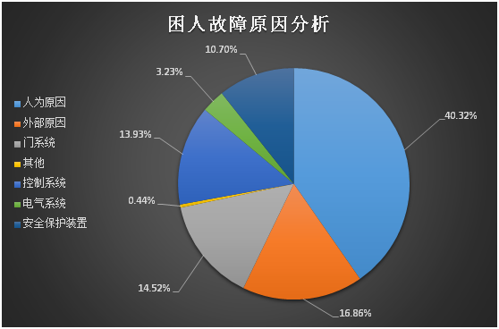 依据《电梯应急处置平台技术规范》(CPASE M001—2019),在人为原因、外部原因、门系统、曳引系统、导向系统、轿厢、控制系统、电气系统、安全保护装置九类故障中:人为原因故障(275起,占40.32%)、门系统故障(115起,占16.86%)、外部原因故障(99起,占14.52%)居前三位,其中生活(装修)垃圾导致开关门受阻困人239起、停电困人67起、门锁失效63起。
