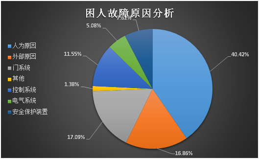 依据《电梯应急处置平台技术规范》(CPASE M001—2019),在人为原因、外部原因、门系统、曳引系统、导向系统、轿厢、控制系统、电气系统、安全保护装置九类故障中:人为原因故障(175起,占40.42%)、外部原因故障(73起,占16.86%)、门系统故障(74起,占17.09%)居前三位,其中生活(装修)垃圾导致开关门受阻困人155起、停电困人30起、门锁失效47起。